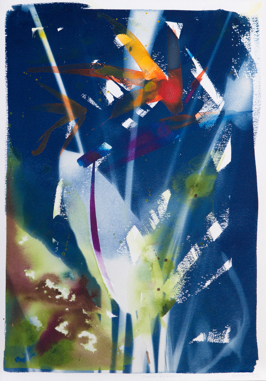 In time, the conjuror's trick was revealed. Now, waiting for nightfall in the high summer evenings, when the damaging light seeps through the cracks in the studio blinds until late into the northern dusk; like an alchemist, I mix my own magic: the cyanotype solution. Then to paint with the moss green liquid: Sometimes as the first thoughts, sometimes onto paintings or drawings: revealing sections, colours, marks, thoughts, memories. By day, I take the paintings into the garden; the landscape; to the Spanish mountainsides of rosemary, and lavender scented cliffs; up the sides of Yosemite valley, along the Merced river below; to the great forests of Sequoia; the bluffs of the Pacific coast, the dunes of the Atlantic...